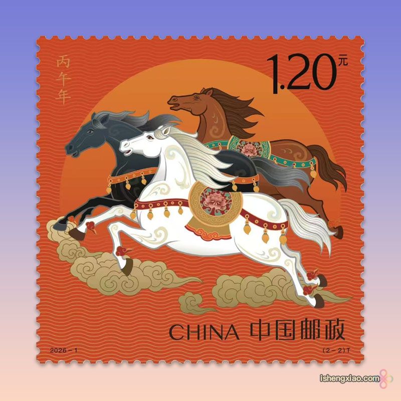 《丙午年》特种邮票图稿2025年10月29日下午15时举行图稿发布仪式,中国邮政集团有限公司党组书记、董事长刘爱力,党组副书记、总经理郑国雨,中国宋庆龄基金会党组书记、副主席沈蓓莉,中华全国集邮联合会会长戴应军,故宫博物院副院长王跃工,文化和旅游部、国家邮政局、中国国家博物馆、清华大学美术学院等单位嘉宾,以及本次生肖邮票图稿大众评审和专家评审代表出席活动。发布仪式上,公布了《丙午年》特种邮票图稿。中国邮政定于2026年1月5日发行的第四轮马年生肖《丙午年》特种邮票,该套邮票征稿首次打破专业限制,自2025年4月27日起面向全民公开征集设计图稿,投稿截止时间为8月15日。由两位设计师完成,邮票一套2枚,面值均为1.20元,采用边长36毫米的正方形规格,《丙午年》特种邮票由王红卫、赵恩重设计。邮票第一枚图名为“驰跃宏图”,以“腾跃新时代”为核心意象,展现了一匹红马奔驰于祥云之上,鬃毛如焰,四蹄生风。第二枚图名为“万骏臻福”,以“万马奔腾,驰骋千里”为核心意象,展现了三匹奔跑的骏马。三为众,寓意奔腾不息、共同奋进。图案背景及马身辅以祥云纹、火焰纹、缠枝纹等传统吉祥纹样,既隐喻福运连绵,亦强化东方美学底蕴。邮票中的骏马既展现出“一马当先”的开拓气概,也诠释了“万马奔腾”的团结力量,将马的形象与新时代中国人民奋发进取的精神风貌完美融合于方寸之间。