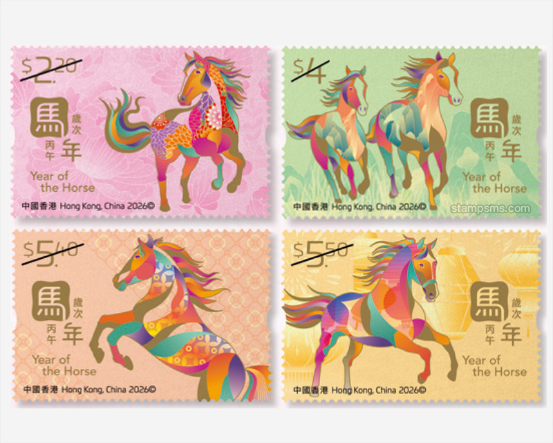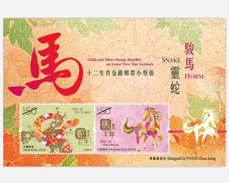 为迎接丙午马年,2026年1月5日香港将发行《岁次丙午(马年)》整套邮票包含四枚邮票及两张邮票小型张,是贺岁生肖邮票第五轮的第三套,各以不同姿态的骏马为主题,配合喜庆洋溢的背景色彩,马身缀以寓意吉祥的图案,整体设计生动活泼,传递出骏马奔腾的贺岁气氛。设计者黄镇康 WONG Chun-hong,十二生肖文化底蕴深厚,承载着中华传统的重要象徵。巳蛇辞旧岁,午马迎新春。香港邮政将特别发行以「灵蛇骏马」为题的十二生肖金银邮票小型张,传递佳节的美好祝愿。生肖邮票上的灵蛇与骏马分别以银箔和22K金箔烫压点缀,金辉银彩,洋溢喜庆典雅之气,更为新春佳节增添祥瑞。黄镇康曾获香港城市大学荣誉博士学位,设计风格上喜好:传统文化与现代视觉技术结合(如邮票上的激光剪纸/镭射效果)、强调节庆与吉祥符号、细节丰富。