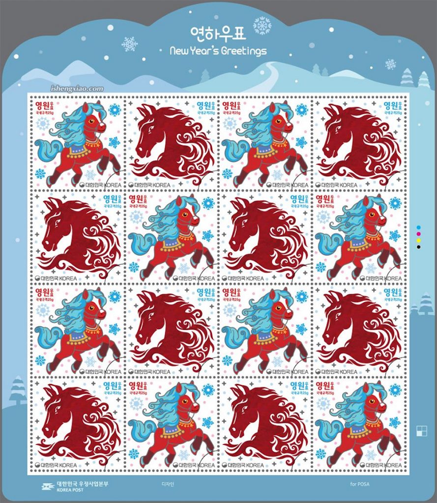 韩国邮政2025年12月1日计划发行的《丙午年》生肖邮票,图案仍沿袭这一轮的风格,一匹活泼的卡通小马駒图案,搭配全息烫印马头像,面值均为430韩元。